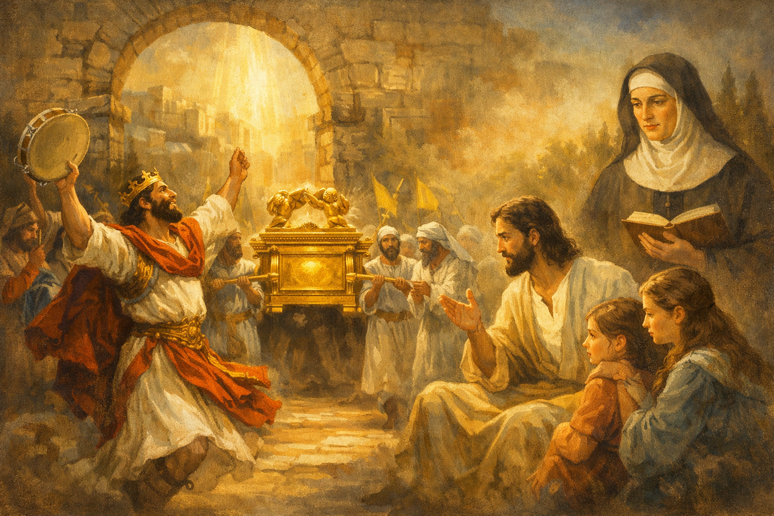 La primera lectura (2 Samuel 6, 12-15.17-19) nos presenta a David danzando ante el Arca de la Alianza. El rey no actúa con cálculo ni con temor al ridículo; se abandona a la alegría que brota de la presencia de Dios. El Arca, signo de la Alianza, entra en Jerusalén acompañada de cánticos, sacrificios y bendición para todo el pueblo. La exégesis bíblica subraya que este episodio marca un punto decisivo: cuando Dios ocupa el centro, la vida del pueblo se ordena y florece. Los Padres de la Iglesia vieron en esta escena una imagen de la verdadera adoración: una fe que involucra todo el ser, cuerpo y alma, y que no se encierra en la intimidad, sino que se expresa públicamente con gratitud.