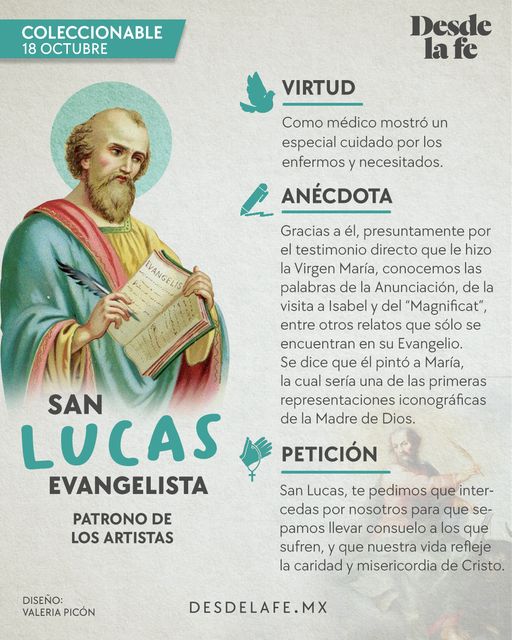San Lucas, evangelista y fiel discípulo, nos recuerda la importancia de la misión y de la fidelidad en los momentos de prueba. Sigamos su ejemplo, anunciando la misericordia de Dios y llevando la paz del Reino de los Cielos a los corazones de quienes nos rodean. Que su intercesión nos fortalezca en nuestra vocación misionera, para que cada uno de nosotros, desde nuestro lugar en la vida, sea un portador de la luz de Cristo.