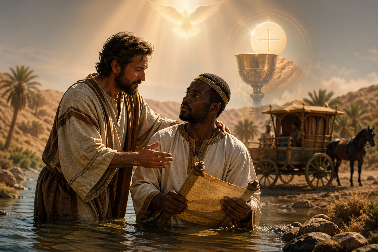 El resultado es inmediato: la fe nace, el corazón se abre, y el bautismo sella ese encuentro. Este pasaje es una verdadera catequesis sobre la misión: la Iglesia no se guarda para sí misma, sino que sale al camino, acompaña, explica y conduce a los sacramentos.