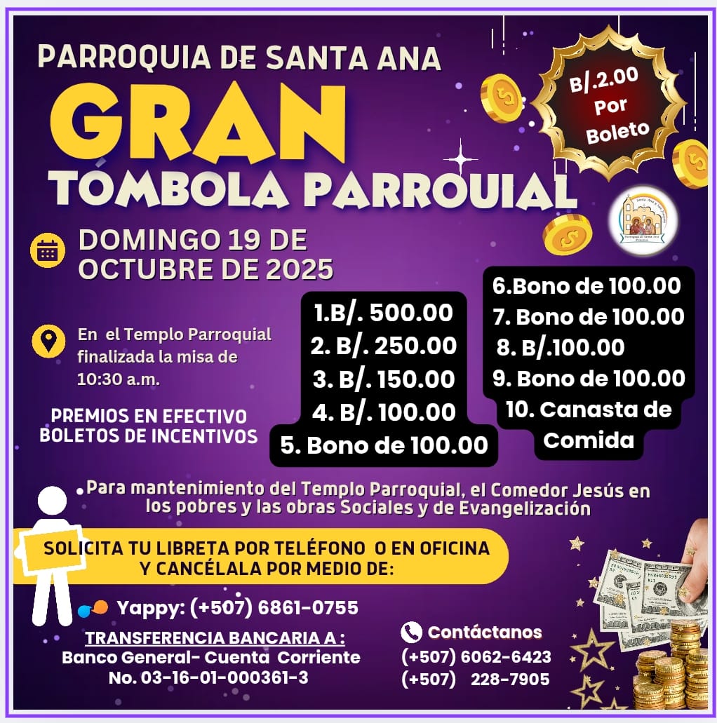 Queridos hermanos, les invitamos con alegría a adquirir sus boletos de la Tómbola Parroquial y a llevar una libreta para compartir en familia y colaborar juntos. Con este gesto sencillo, no solo participas en una hermosa tradición comunitaria, sino que también apoyas a las obras de misericordia y al sostenimiento y mantenimiento de nuestro querido templo parroquial de Santa Ana y San Joaquín.
