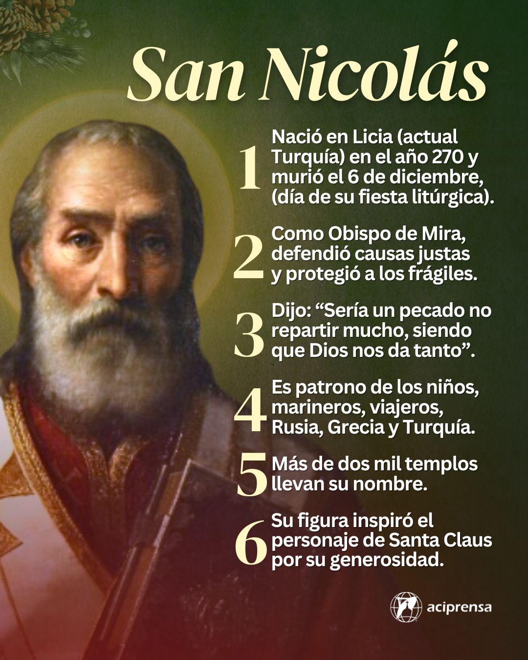 San Nicolás vivió el Evangelio con radicalidad, siendo una luz en su tiempo. Su ejemplo nos muestra que la santidad no es algo reservado para unos pocos, sino un llamado para todos. Como él, estamos llamados a ser testigos vivos del amor de Dios, construyendo un mundo donde la esperanza y la caridad sean visibles.